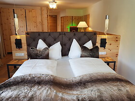 ...con balcone, 2 camere da letto separati con due letti matrimoniali, pavimento in legno, tavolo d’angolo, frigorifero, bollitore con selezione di tè, fontanella dell’acqua di sorgente, 2 TV, WiFi, telefono, cassaforte, bagno con doccia, WC, bidet, phon, specchio per truccarsi, borsa wellness con asciugamano e accappatoio.